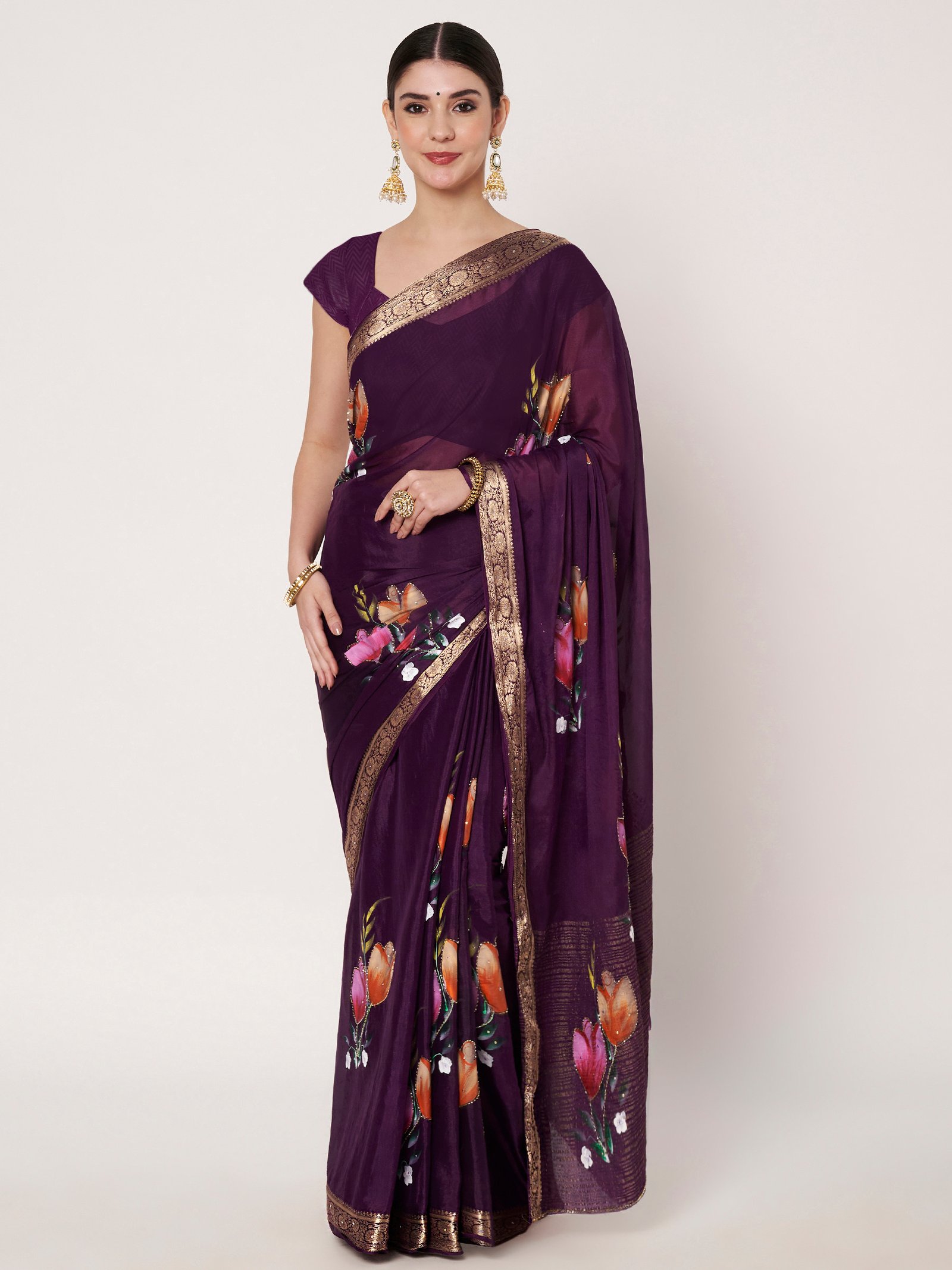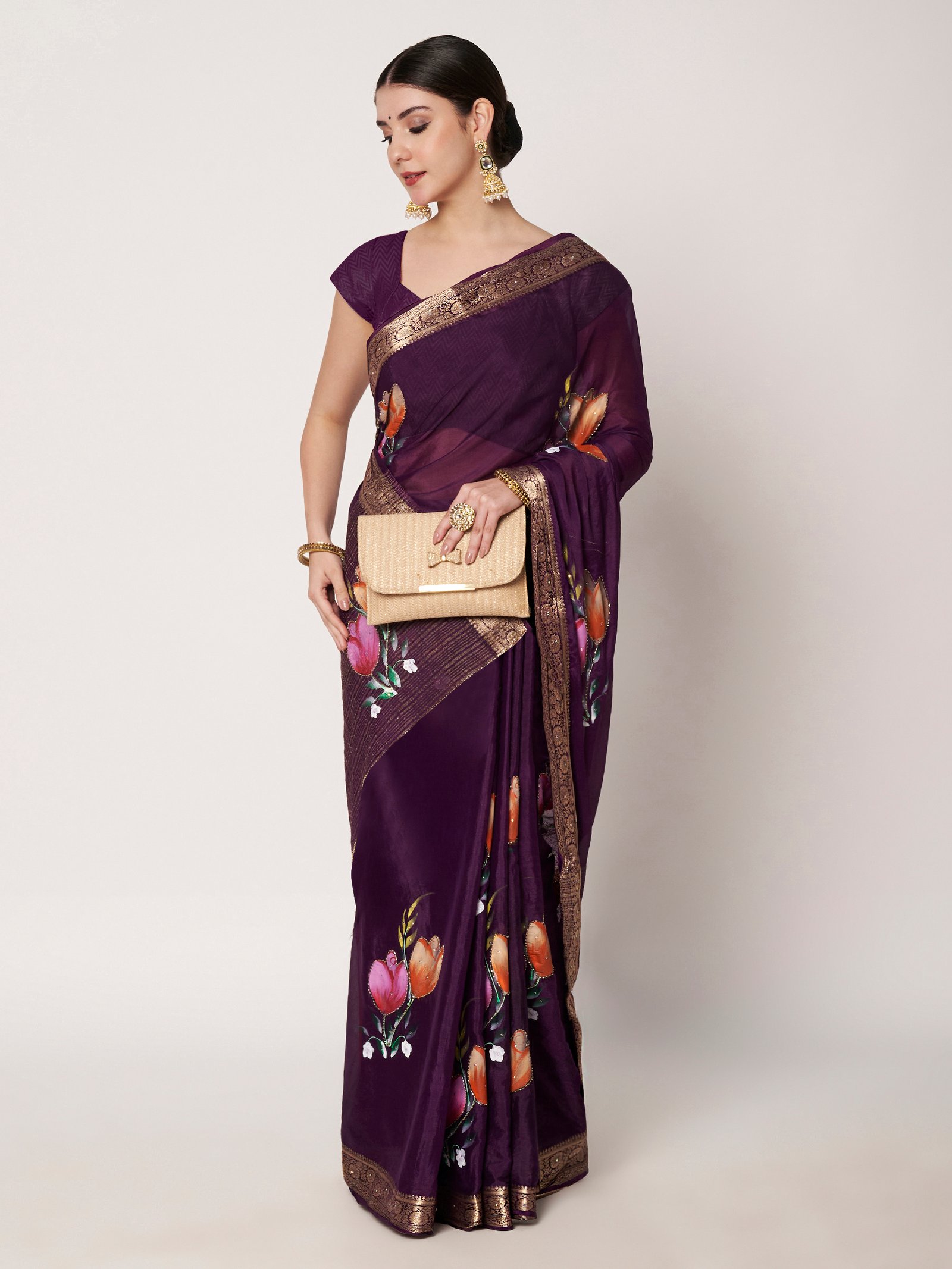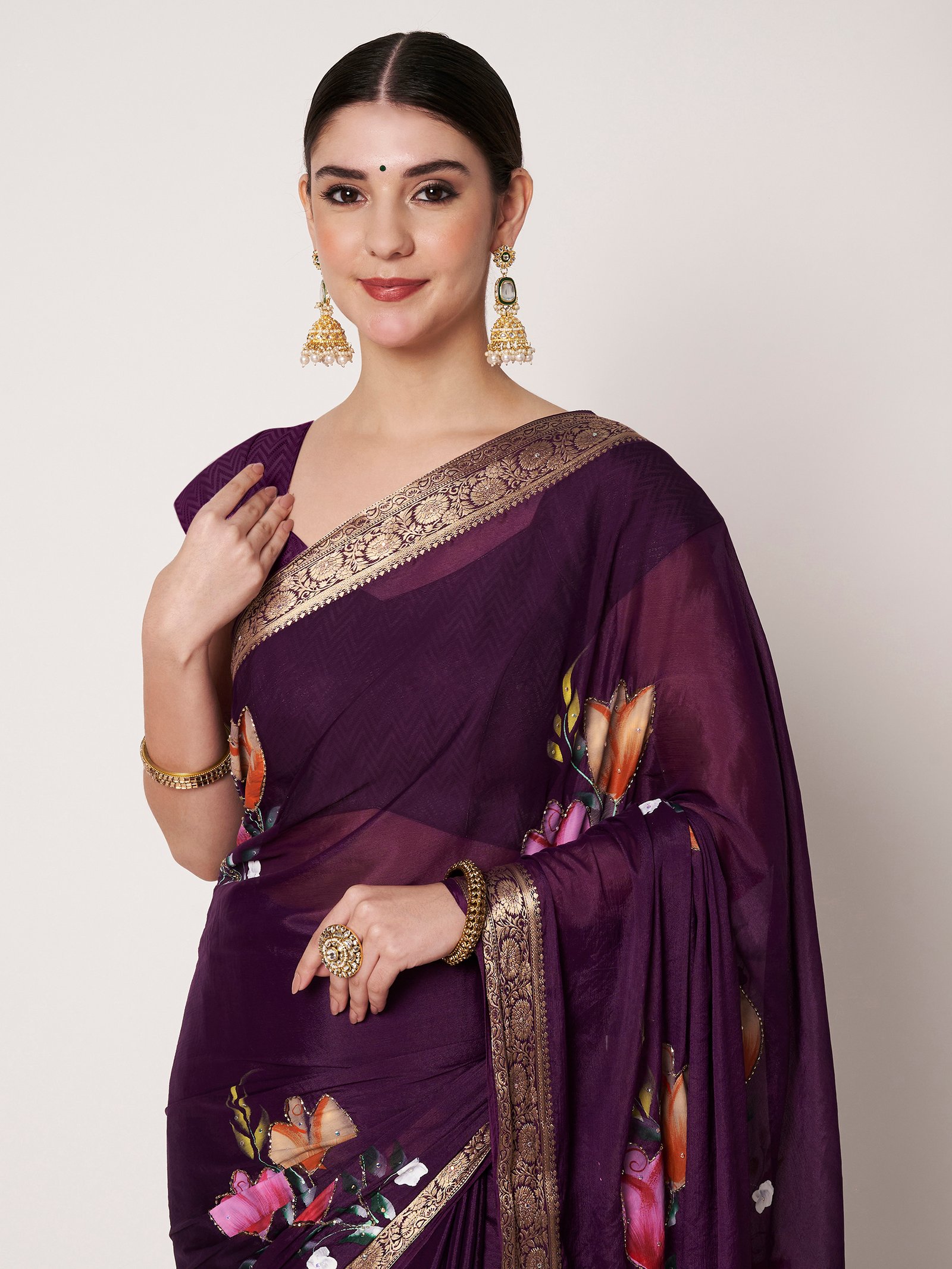 Comfortable, breathable, and stylish, this Purple Floral Printed Chinon Chitt Pallu Saree is a versatile addition to your collection and an excellent choice for both special occasions and elegant everyday wear.