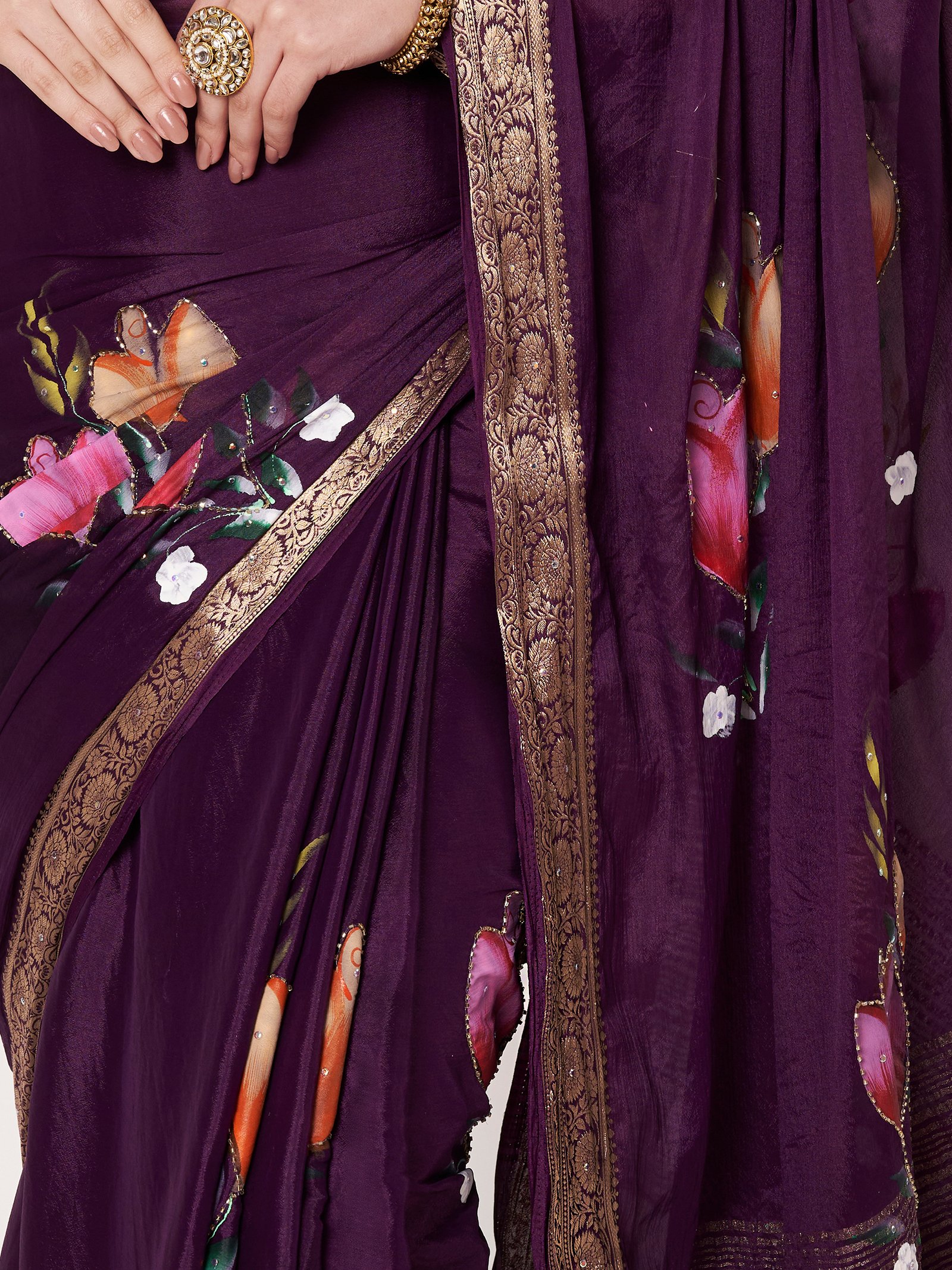 Purple Floral Printed Chinon Chitt Pallu Saree, crafted to offer effortless elegance and comfort. Made from high-quality Chinon fabric, this saree feels lightweight, smooth, and drapes beautifully, making it ideal for extended wear.
